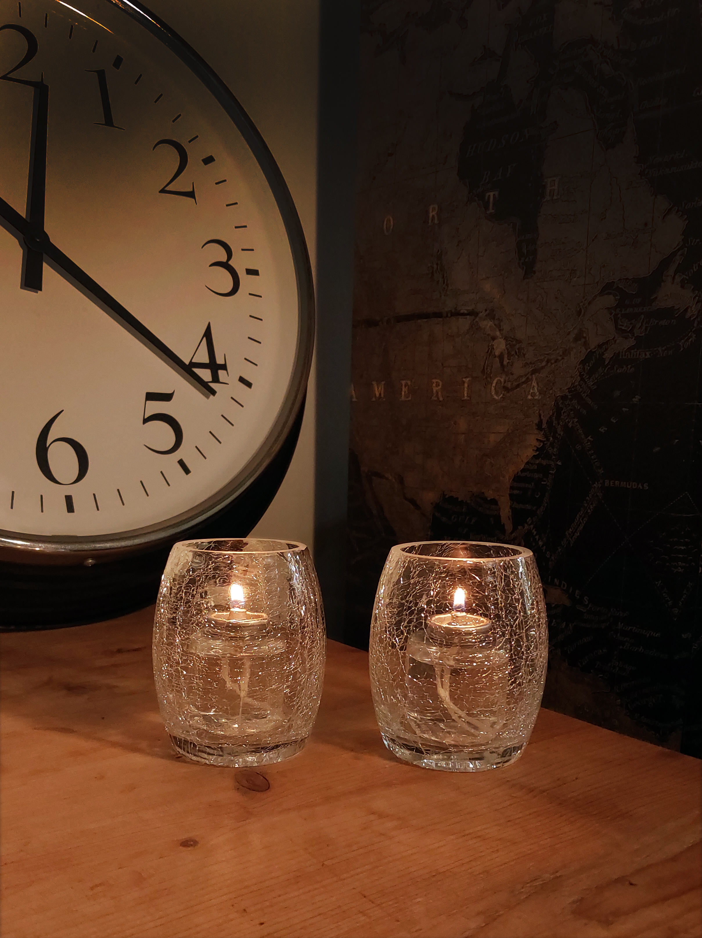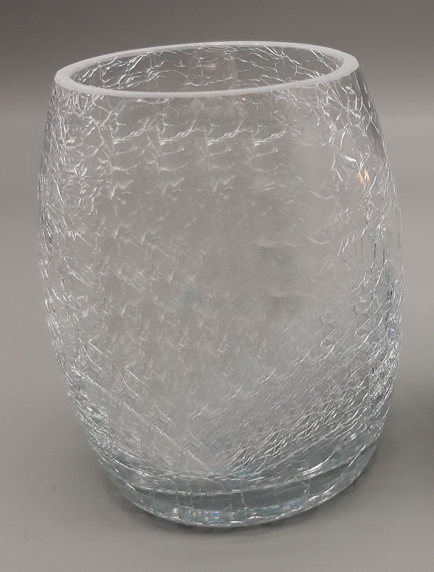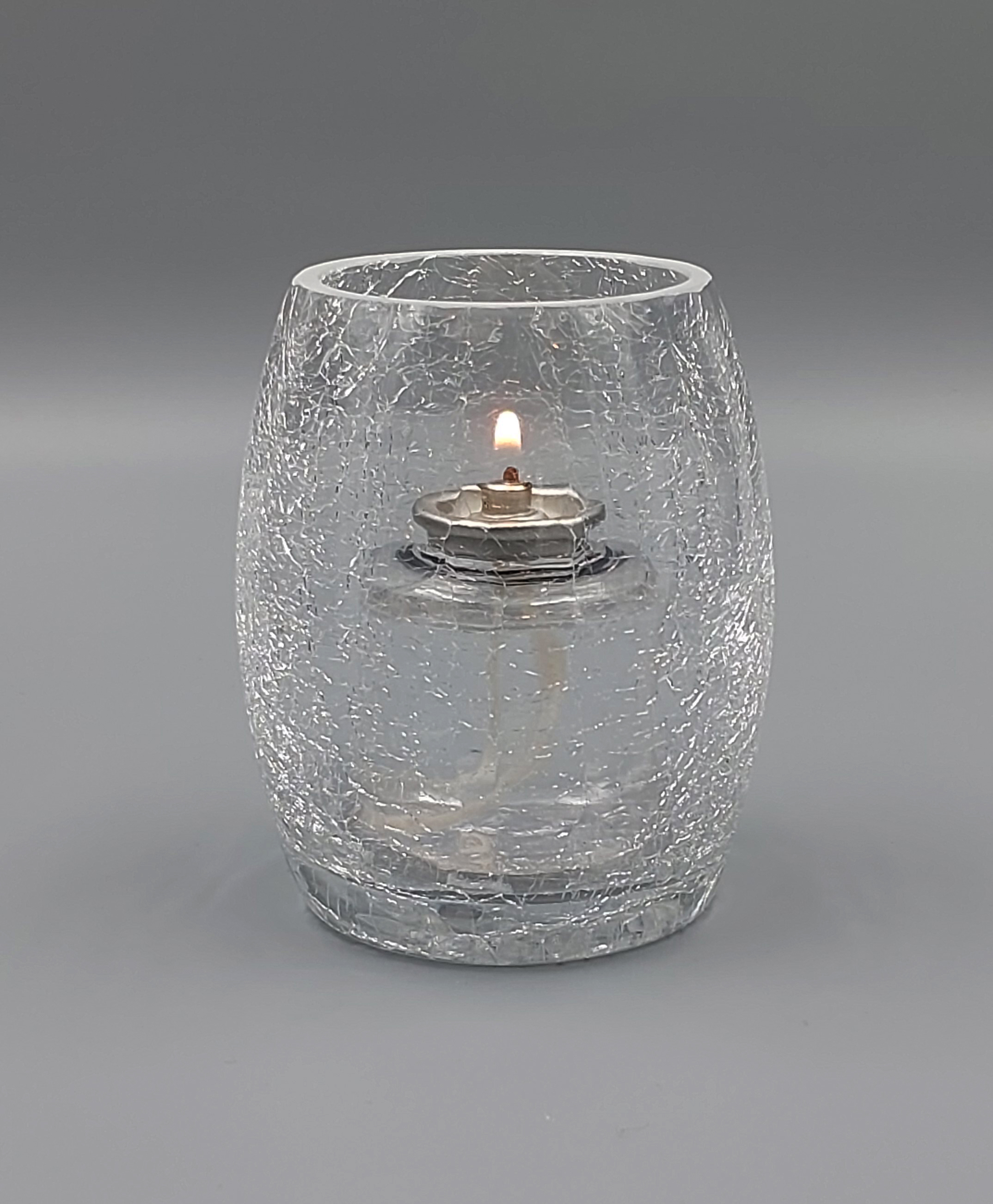 A lovely crackled design that diffuses light and partially obscures the candle within. The glass is thick with a machine ground finish